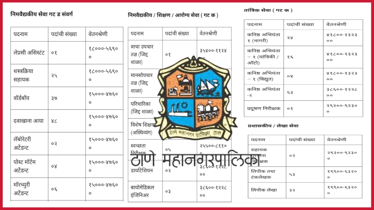 ठाणे महानगरपालिका अंतर्गत गट क व ड संवर्गातील विविध पदांच्या तब्बल 1773 रिक्त जागेसाठी महाभरती प्रक्रिया राबविण्यात येत आहे . तरी पात्र / इच्छुक उमेदवारांनी विहीत कालावधीमध्ये ऑनलाईन पद्धतीने आवेदन सादर करायचे आहेत . ठाणे महानगरपालिकेच्या प्रशासकीय सेवा , लेखा सेवा, तांत्रिक सेवा , अग्निशमन सेवा , निमवैद्यकीय सेवा , शिक्षण सेवा , वैद्यकीय सेवा … Read more