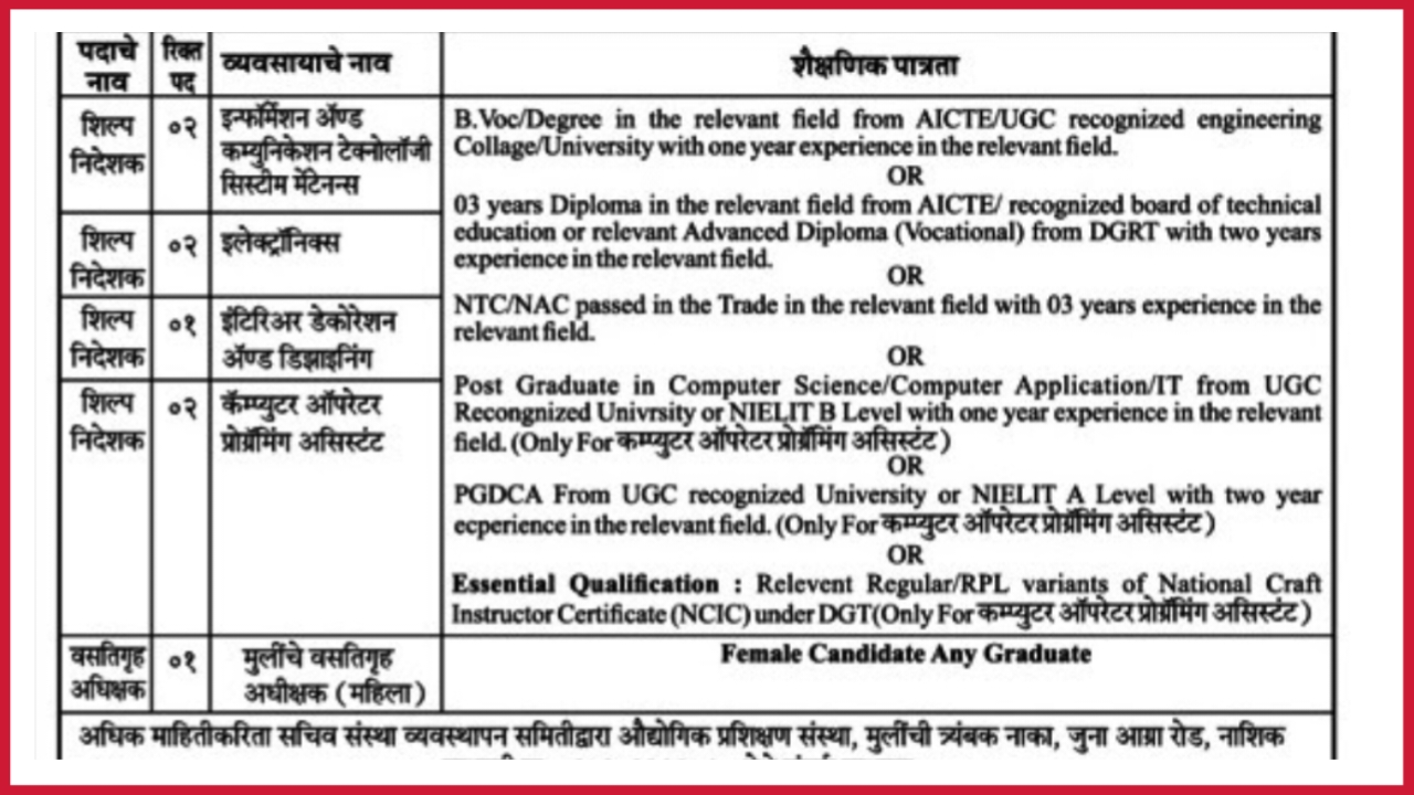 औद्योगिक प्रशिक्षण संस्था , मुलींचे नाशिक अंतर्गत विविध पदांसाठी पदभरती ; लगेच करा आवेदन !