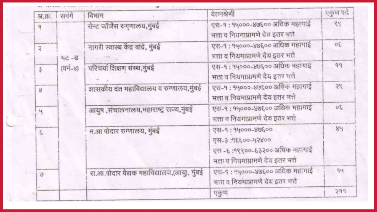 GMC : सरकारी वैद्यकीय महाविद्यालय मुंबई अंतर्गत गट ड संवर्गातील 211 रिक्त जागेसाठी सुधारित पदभरती !